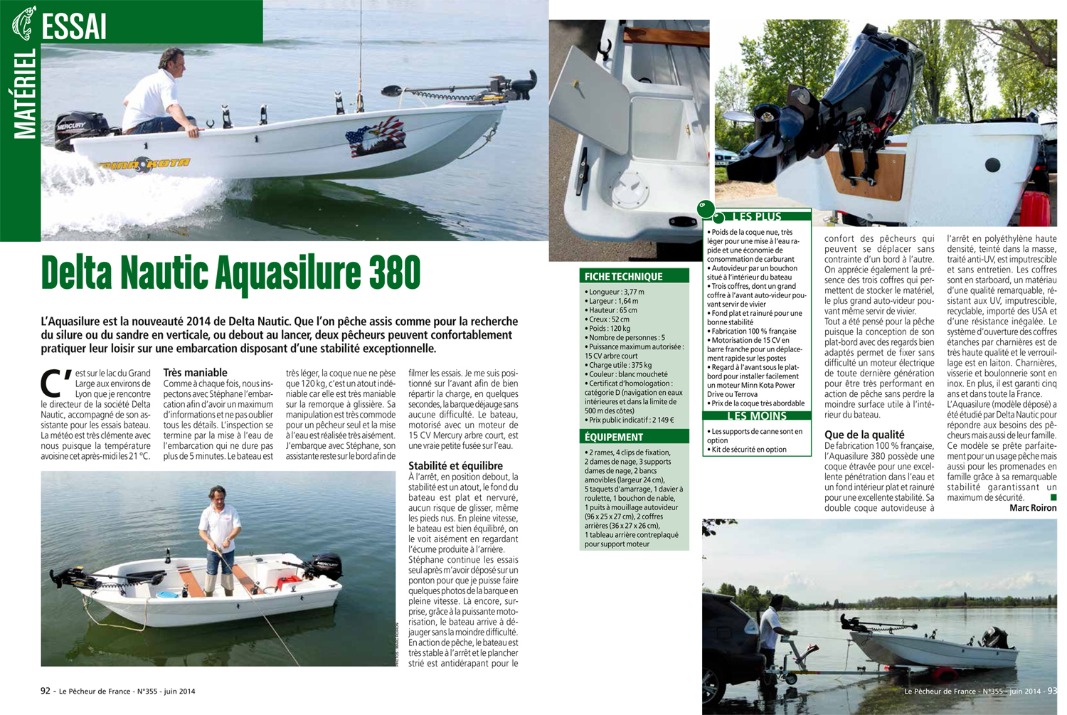 Barque Aquasilure 380 testée et approuvée par M. Tarragnat, revue "la pêche et les poissons", juin 2014 : voir l'article de presse